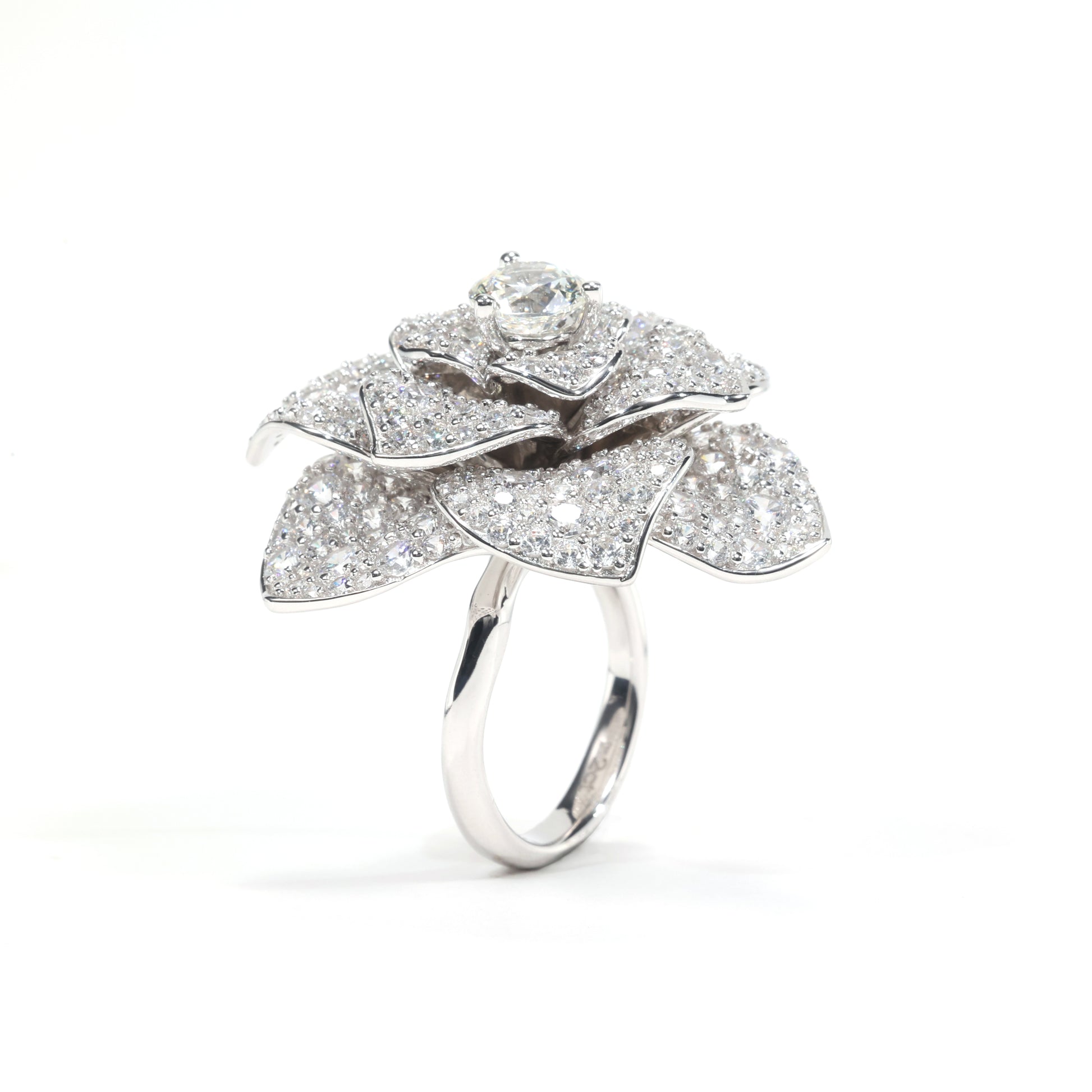 Micro-setting Clear diamond color Lab created stones luxury Camellia ring, sterling silver.