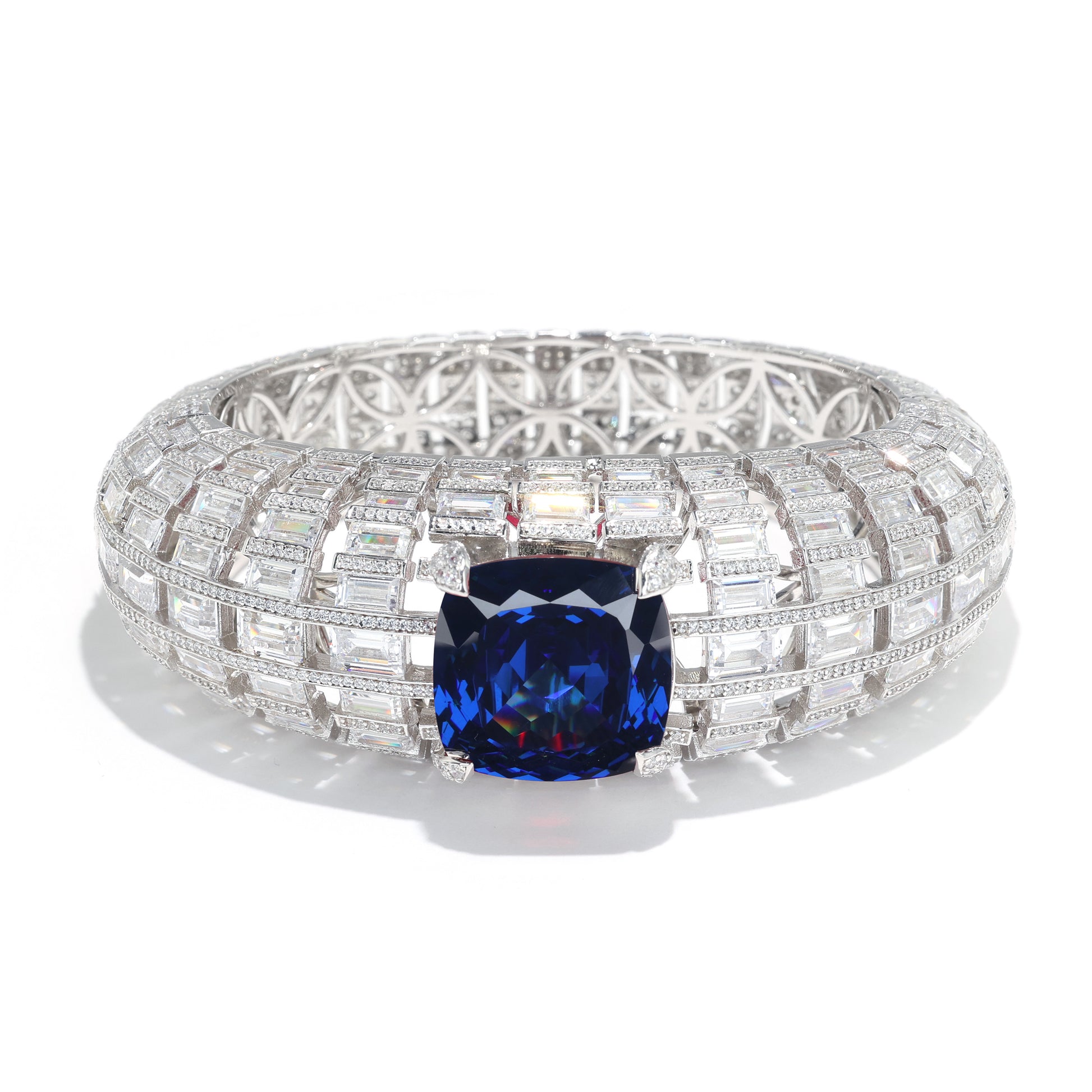 Micro-setting Sapphire color Lab created stones Art deco bangle, sterling silver.