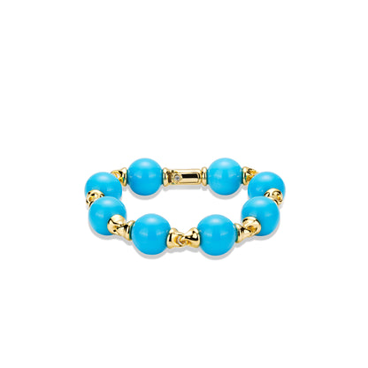 The dyed blue turquoise, carefully chosen for its rich color, infuses the bracelet with a sense of artistry and natural beauty. The spherical beads, reminiscent of a bygone era, lend a nostalgic appeal to the piece, creating a bracelet that seamlessly combines modern fashion with vintage allure.