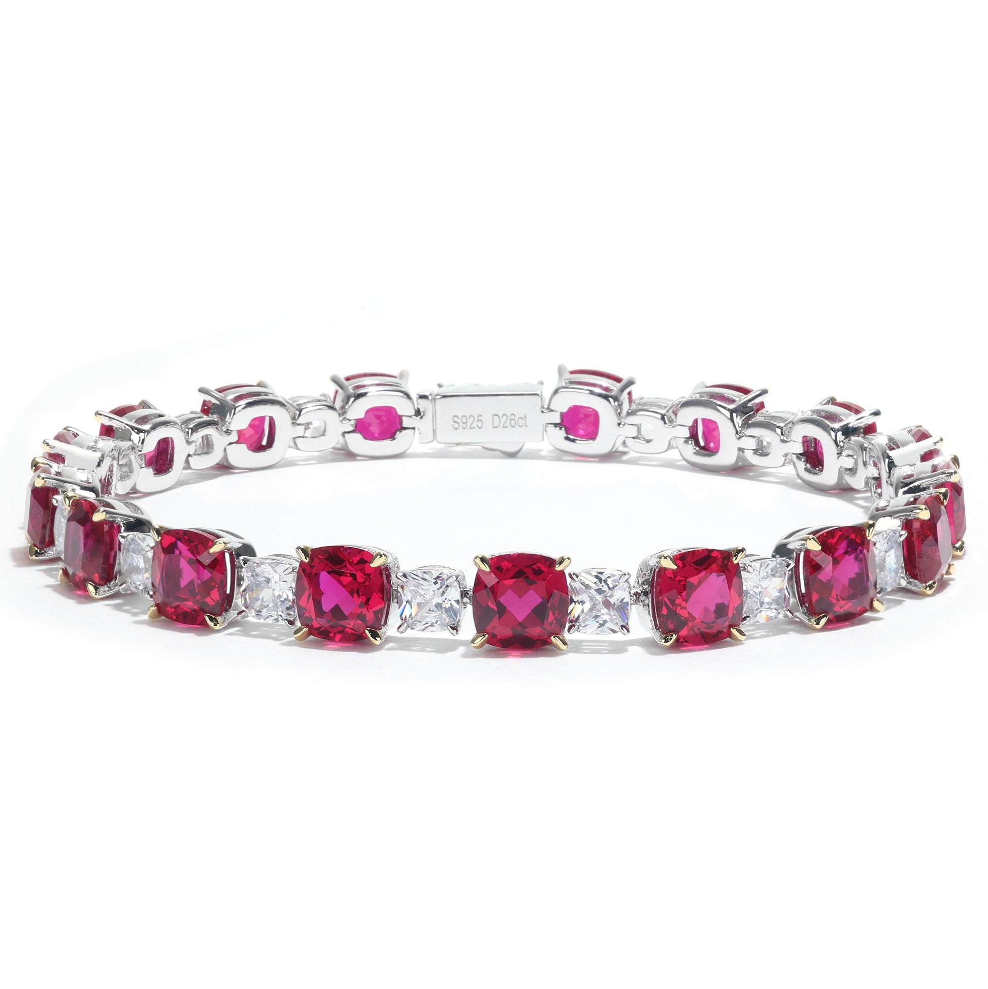 Only 1 piece Micro-setting Ruby and clear diamond color Lab created stones cushion modern tennis bracelet , sterling silver