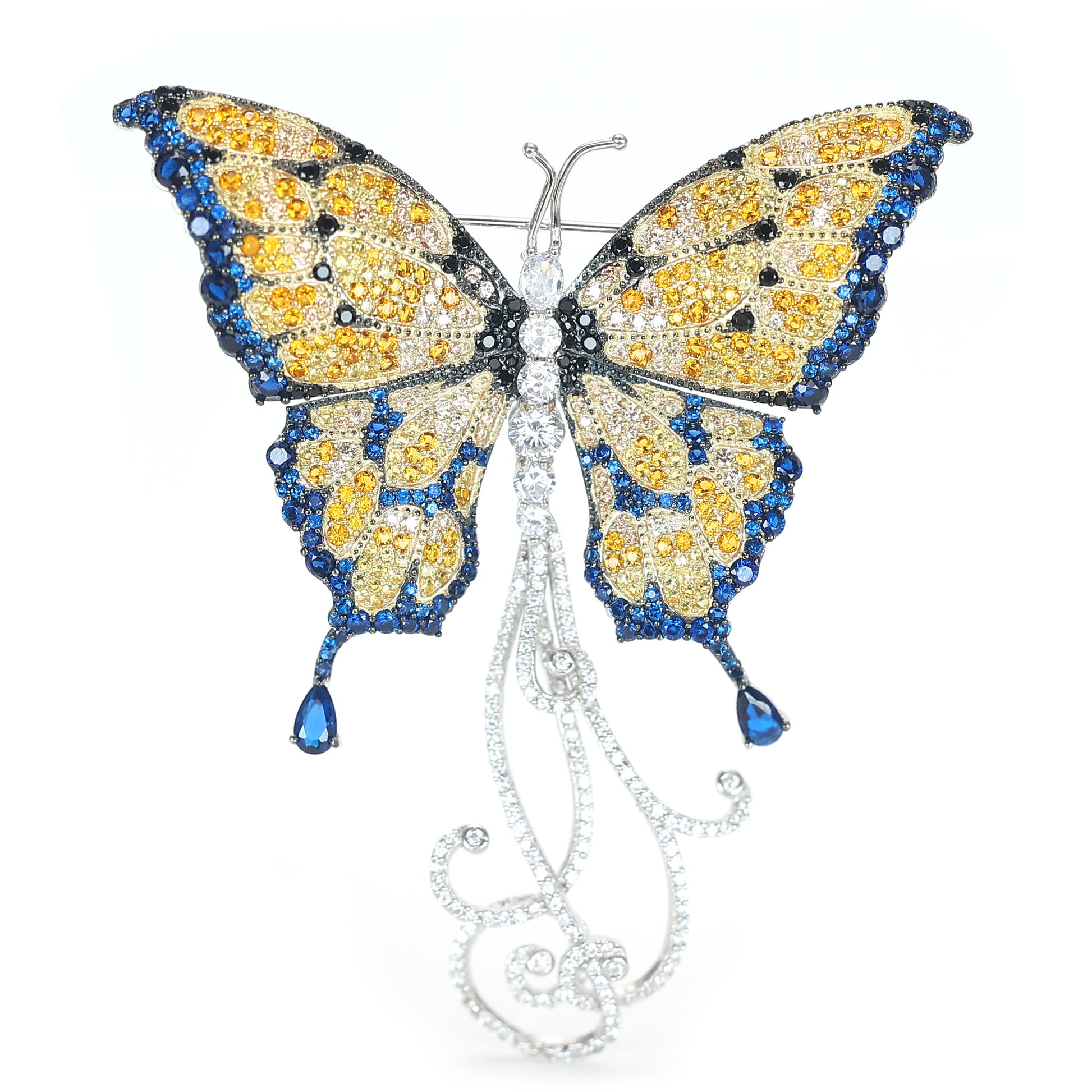Micro-setting mixed diamond colors Lab created stones butterfly brooch, sterling silver.