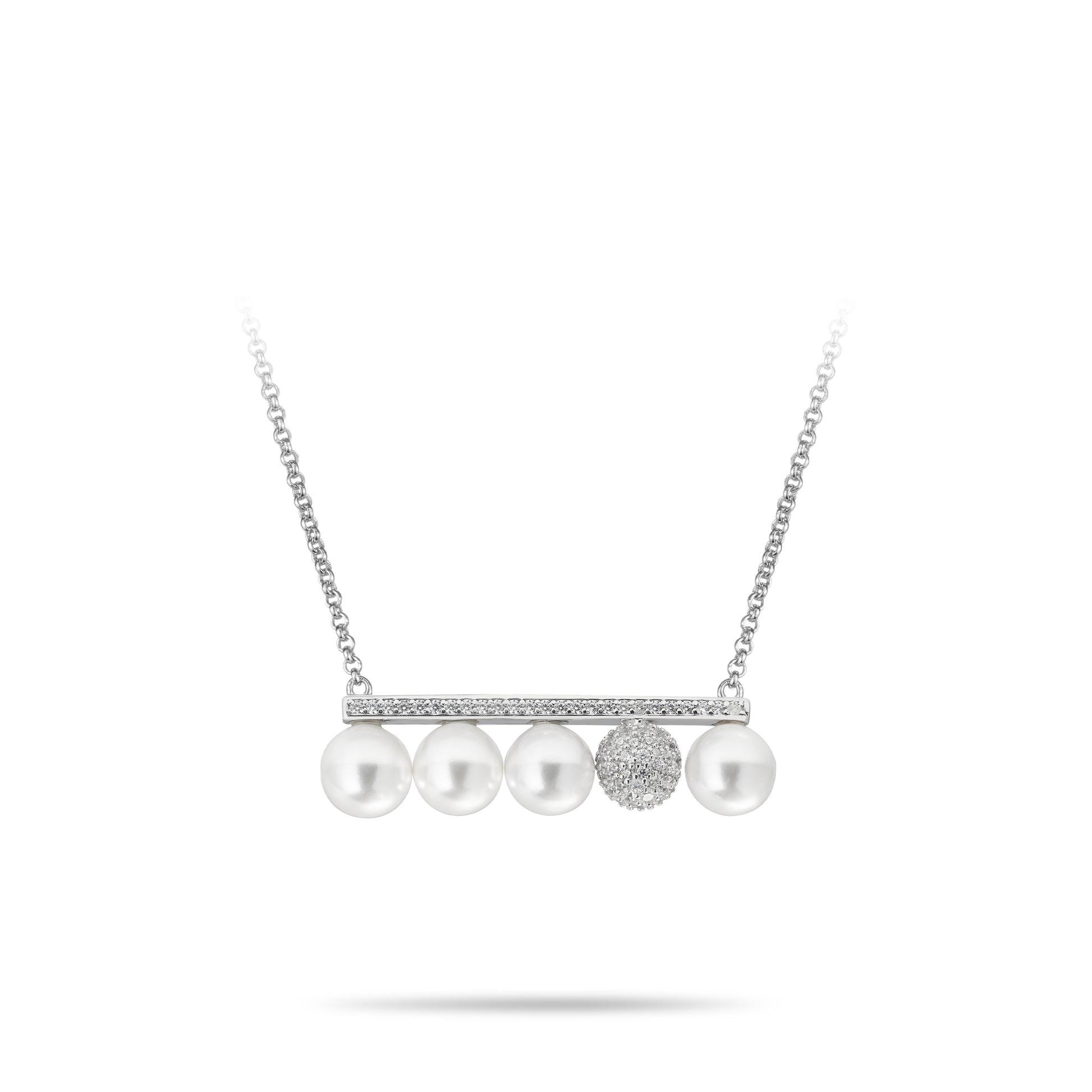 Crafted with eco-friendly artificial diamonds, Lustrous high quality White Shell Pearls, in sterling silver.
