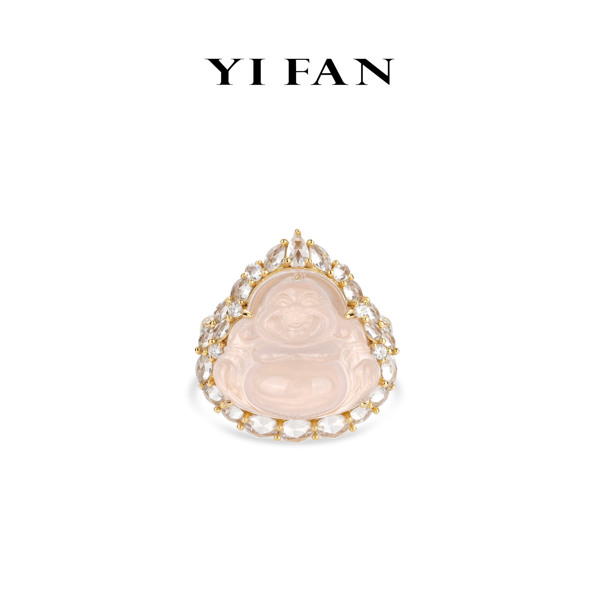 Pre-order High Jewelry Collection: Golden Light Pink Icy Jade Maitreya the "Laughing Buddha," detailed Ring