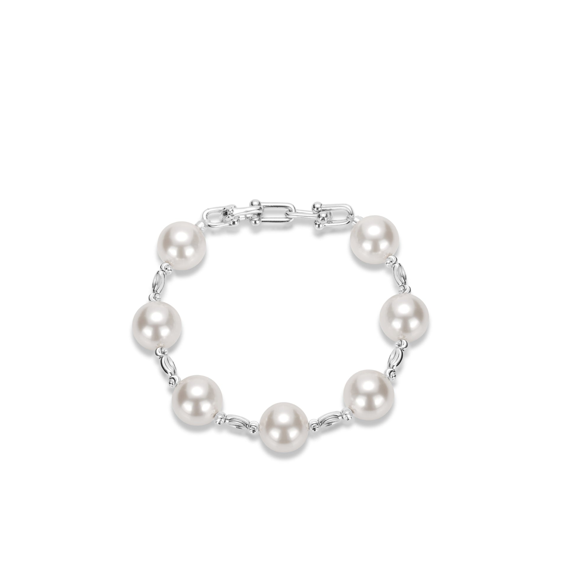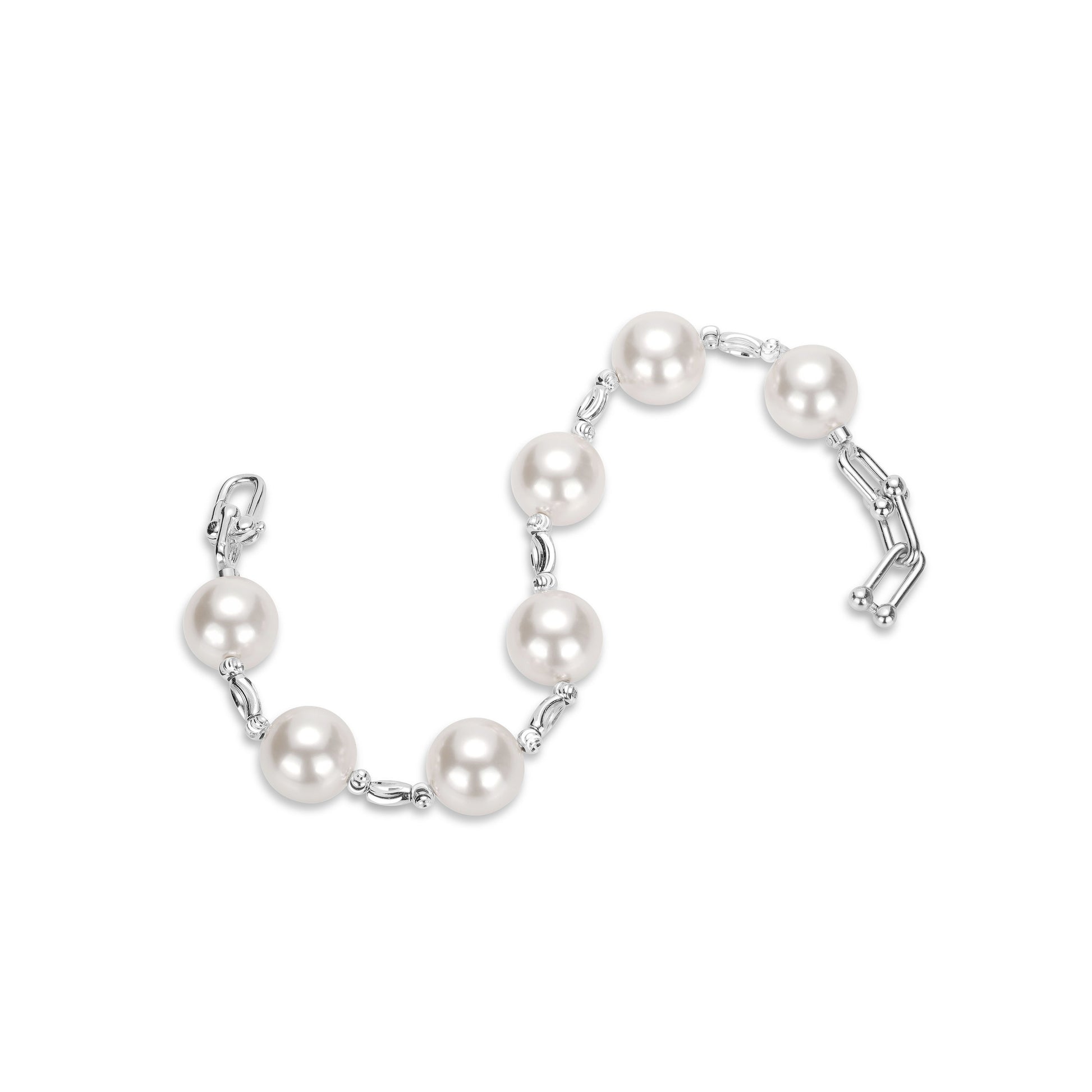 The chic chain design sets this bracelet apart, providing a modern and versatile look that effortlessly complements both casual and formal attire. The luminous white pearls add a classic touch, creating a perfect balance between contemporary fashion and timeless elegance.