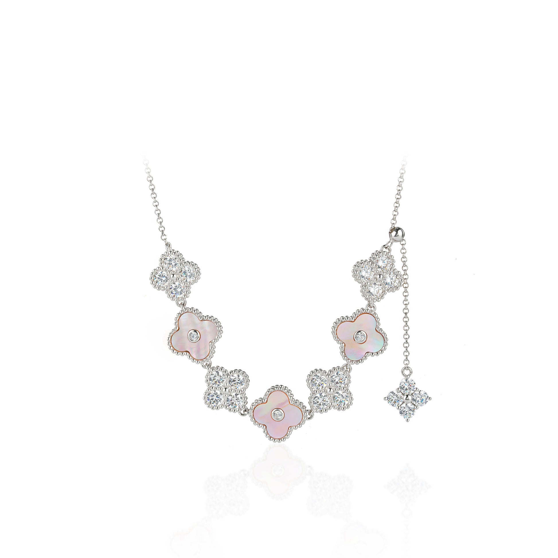 Eco-friendly artificial clear diamond color Lab created stones + White shell, sterling silver.
